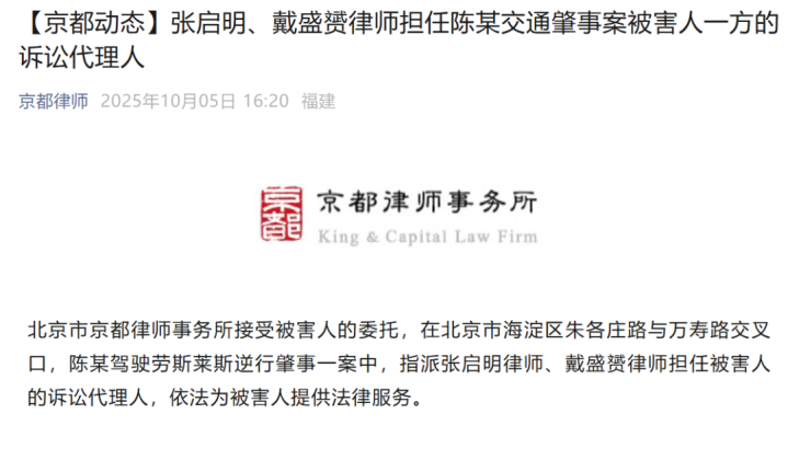10月5日,京都律师事务所发文:北京市京都律师事务所接受被害人的委托,在北京市海淀区朱各庄路与万寿路交叉口,陈某驾驶劳斯莱斯逆行肇事一案中,指派张启明律师、戴盛赟律师担任被害人的诉讼代理人,依法为被害人提供法律服务。